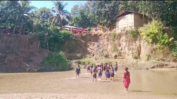 লামার বমুখালে একটি ব্রিজের অভাবে কোমর পানি পেরিয়ে চলাচল করছে দুইশত শিক্ষার্থীসহ ৪ হাজার মানুষ