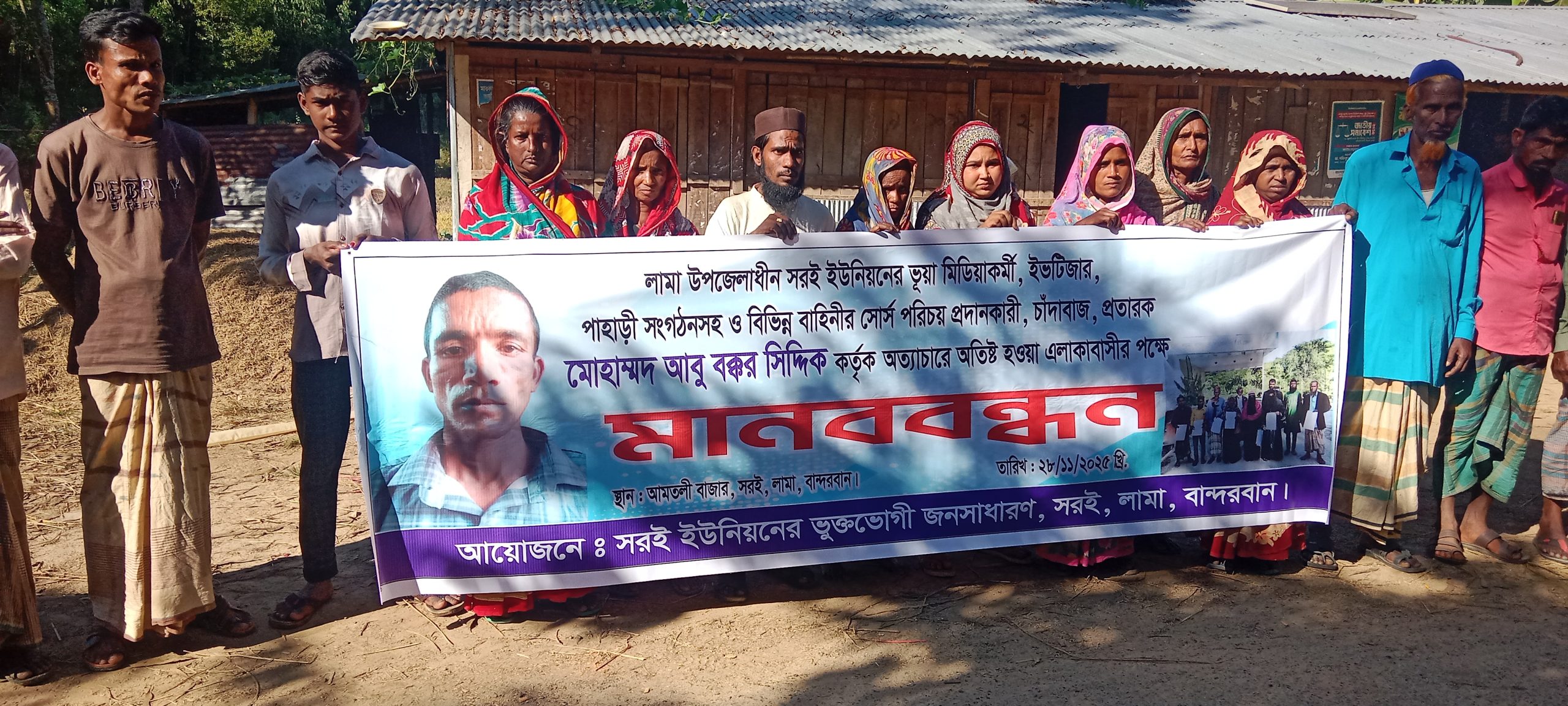 মোঃ আবু বক্কর সিদ্দিক এলাকার সহজ-সরল পরিবারের লোকজনকে বিভিন্ন ভাবে প্রলোভন দেখিয়ে বিশ্বাস জন্মাইয়া প্রতারণামূলক ভাবে শতাধিক মানুষের কাছ থেকে লক্ষ লক্ষ টাকা আত্মসাৎ করে আসিতেছে। এ কারণে এলাকার মানুষ চরম বিপদে আছে। তার বিরোদ্ধে যথাযত ব্যবস্থা গ্রহনের জন্য প্রশাসনের প্রতি দাবী জানিয়ে লামার সরই ইউনিয়নের ৭নং ওয়ার্ডের আমতলী এলাকায় এলাকাবাসীর উদ্যোগে ২৮/১১/২০২৫ ইং তারিখ বিকাল ৩ ঘটিকার মোঃ আবু বক্কর সিদ্দিকির বিরোদ্ধে এ মানববন্ধন করে।